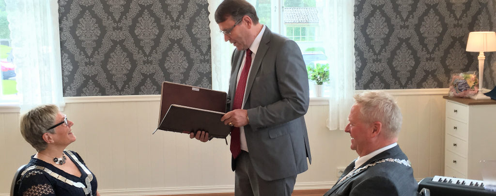Her kan du lese alt om prosessen som ledet fram til dannelsen av nye Lyngdal kommune. Fra de aller første sonderingene, til "vielsen" på Kvåstunet 15. juni 2017 (bildet) og fram til sammenslåingen var et faktum 1. januar 2020. På bildet ses ordførerne Reidun Bakken og Jan Kristensen, sammen med pastor og folkevalgt, Sten Sørensen, som besørget den seremonielle delen av det historiske "bryllupet i Kvås" (Foto: Svein Sundsdal, NRK)